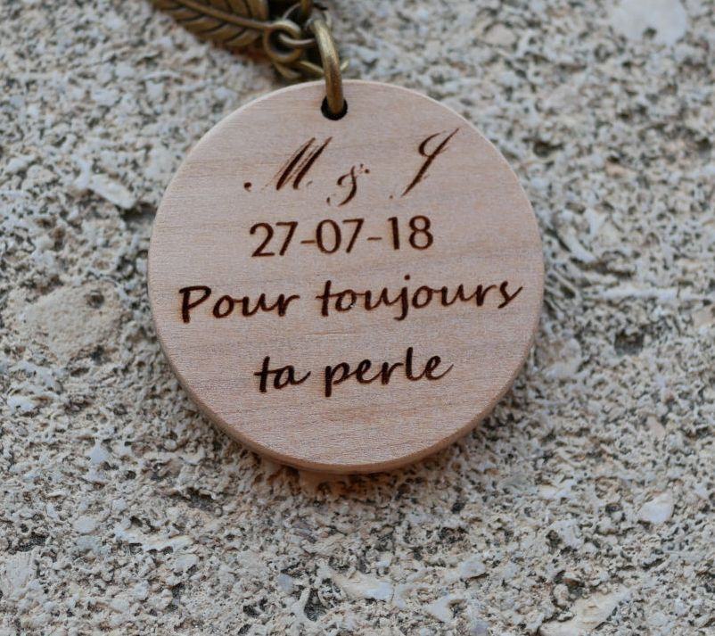 Ett runt hänge i naturträ med graverade små blommor och berlocker: en gammal bronsberlockerare efter eget val och en naturlig Unakite-stenpärla. Perfekt som gåva till ett par eller som bröllopsgästpresent med en av våra matchande träsnoddar för herrn. Den runda är gjord av körsbärsträ (från ett sågverk i Ardèche-regionen i Frankrike), som lämnas naturligt. Baksidan av träpendeln kan graveras med söta ord, ett litet kärleks- eller vänskapsbudskap. Välj i detta fall Med gravering och ange din text som ska graveras (möjliga symboler som ett hjärta, oändlighet, kors, stjärna), du kan ange särskilda instruktioner för graveringen och välja typsnittet för skrivandet. Dimensionen på det runda träpendlet: 35 mm i diameter. Tjocklek: 5 mm. Monterad på en bronsfärgad kedja med fina länkar. Kedjans längd: 46 cm + 5 cm förlängningskedja. Standardberlocken är bladet eller ange referens till den berlock du föredrar (enligt fotot av berlocken). Välj också vilken presentförpackning du föredrar.