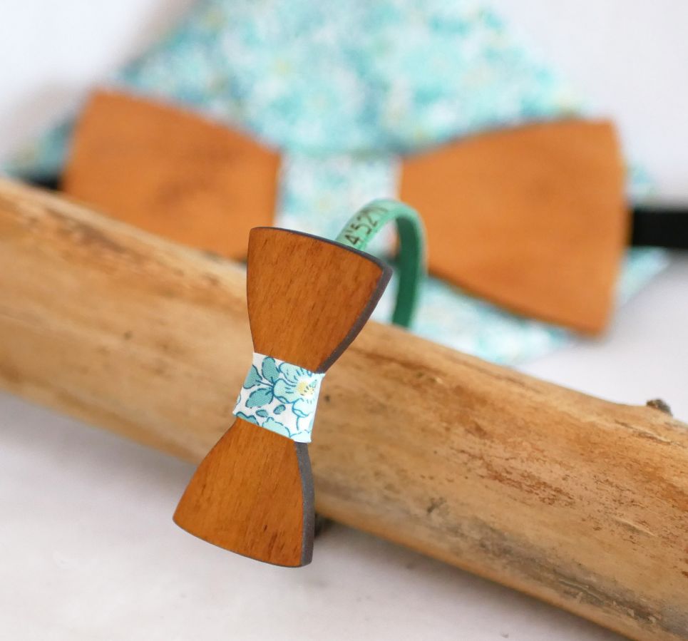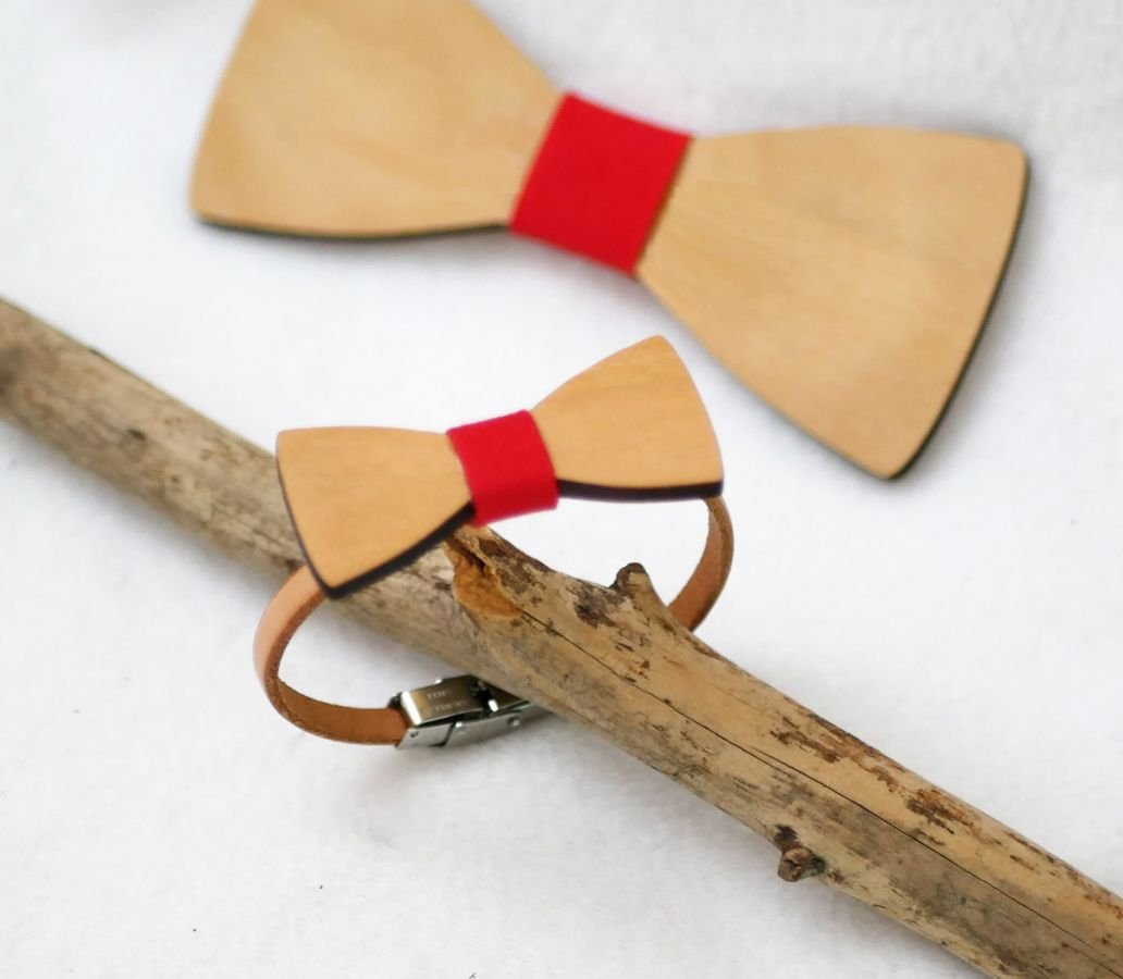 Ett läderarmband med en miniatyrbåge i trä dekorerad i mitten med ett tygband att välja mellan: ett smycke som matchar våra flugaftor för män, tonåringar och barn för ett vackert par eller en familjehelhet för ett bröllop eller en speciell händelse.