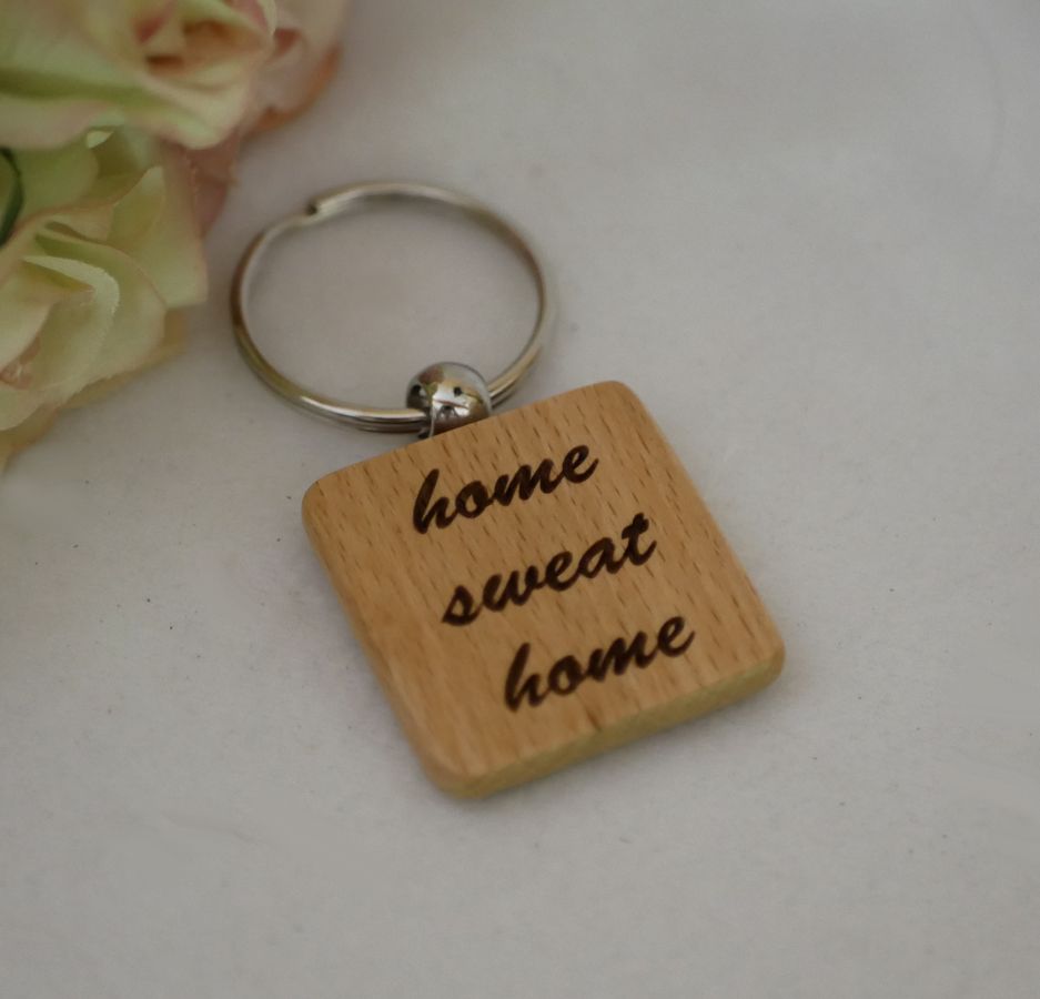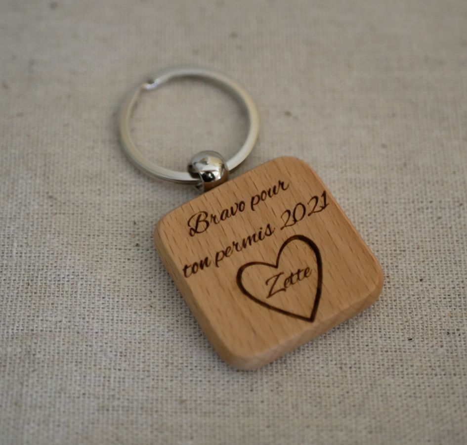 Fyrkantig nyckelring i trä med personlig gravyr. På ena sidan graverad med S:t Kristoffer, resenärernas beskyddare och bärare av Jesus, och på den andra sidan med din egen text, namn och datum: en gåva som uppskattas vid alla tillfällen, perfekt för ett nytt körkort eller en ny bil