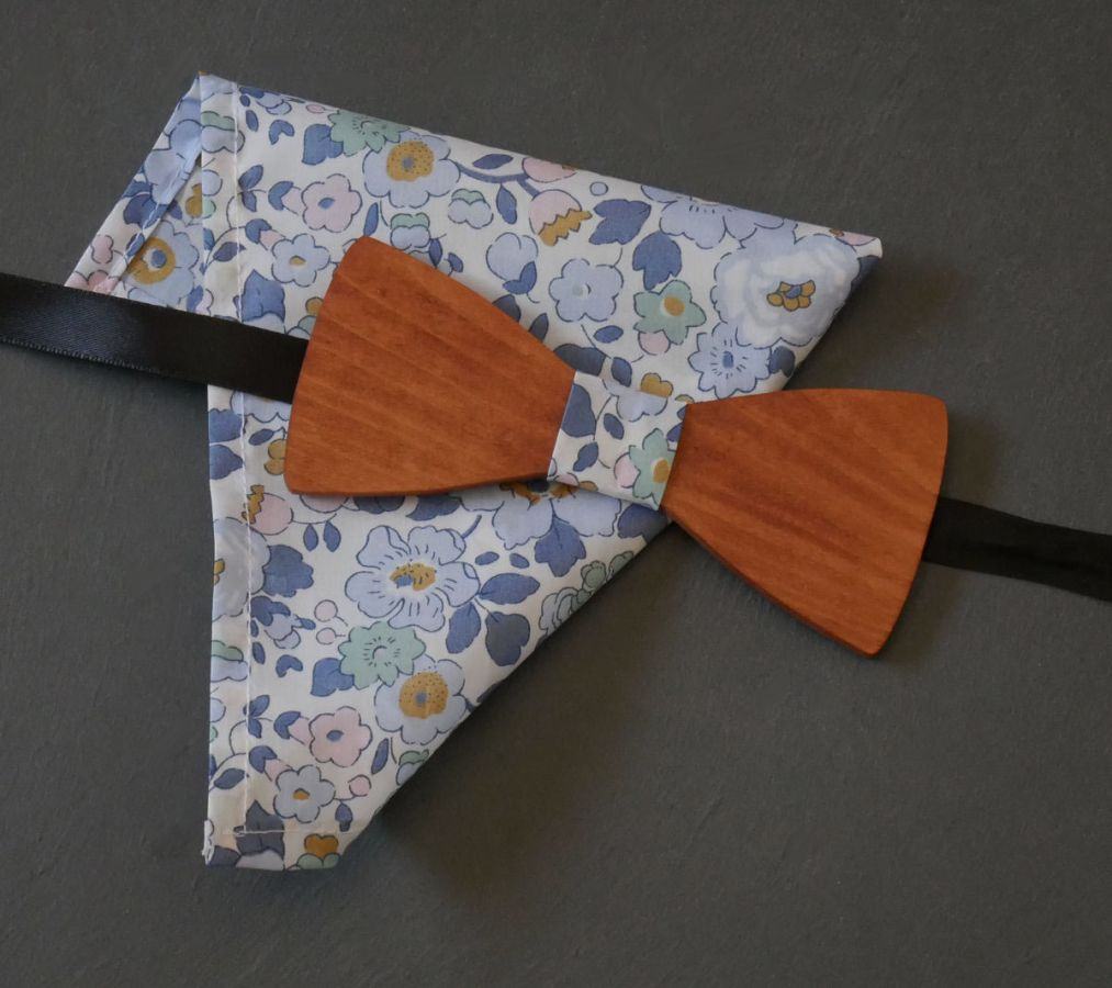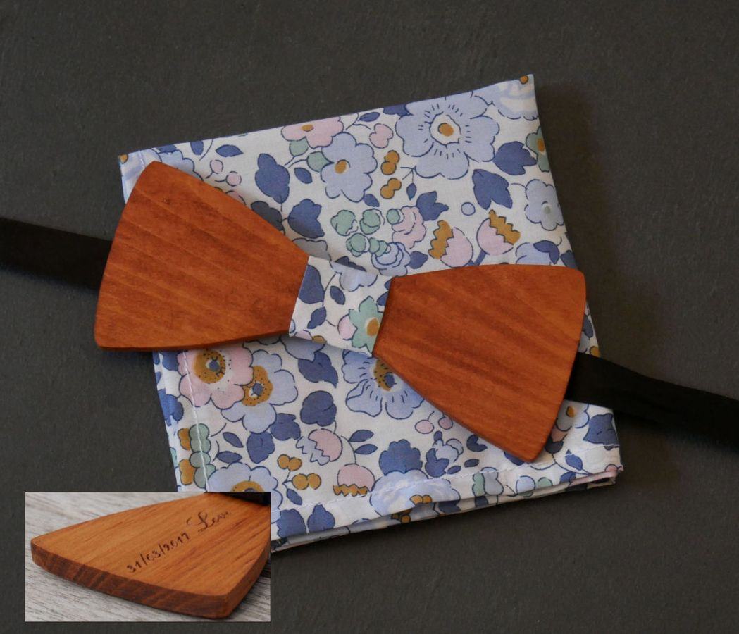 Den här flugan kan personaliseras (utom modell G) genom lasergravyr med ett namn, ett litet citat, datum för händelsen (t.ex. födelsedag, bröllopsdatum), roll i bröllopet (brudgummen, brudens far...). Det är möjligt att gravera höger och vänster sida och även insidan av flugan för ett diskret personligt meddelande. Handgjord i Frankrike, franskt körsbärsträ (med ursprung i Frankrike, från hållbart förvaltade skogar och från ett sågverk i Ardèche). Träet kan lämnas naturligt eller oljas med linne (ger en gyllene honungsfärg) eller betsas med körsbär eller valnöt (mörkaste färgen): se foto av de 4 möjliga träfärgerna. Mått på den matchande fyrkantiga tygpåsen i Liberty-tyg: 22 x 22 cm. Välj vilken presentförpackning du föredrar för detta set med fluga och påse.