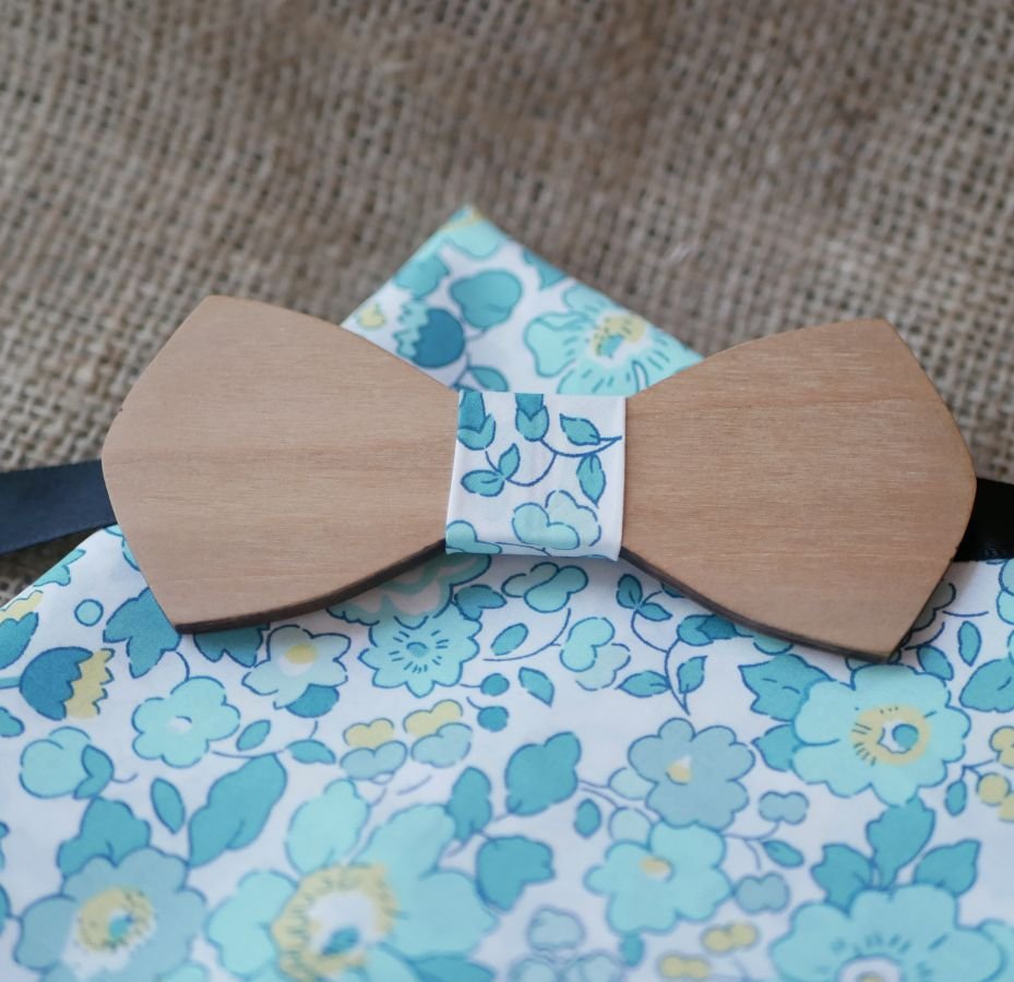 kan välja träets form (bland 8 möjliga former), träets ytbehandling och till och med bandets fästanordning. Denna fluga kan personaliseras genom lasergravyr med ett namn, ett litet citat, datum för händelsen (t.ex. födelsedag, bröllopsdatum), roll i bröllopet (brudgummen, brudens far...). Det är möjligt att gravera höger och vänster sida och till och med insidan av flugan för ett diskret personligt meddelande. Handgjord i Frankrike, franskt körsbärsträ (med ursprung i Frankrike, från hållbart förvaltade skogar och från ett sågverk i Ardèche). Träet kan lämnas naturligt eller oljas med linne (ger en gyllene honungsfärg) eller betsas med körsbärsträ eller valnöt (mörkaste färgen): se foto av de 4 möjliga träfärgerna. Mått på den matchande fyrkantiga tygpåsen i Liberty-tyg: 22 x 22 cm.