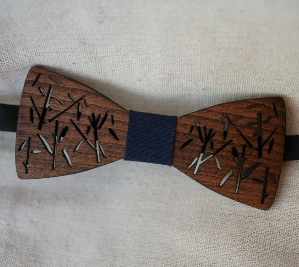 Fransk pilbåge i körsbärsträ tillverkad i vår verkstad med ett centralt band som du kan välja mellan 40 färger och tryck. De urholkade formerna påminner om en bambushäck med käppar och bladverk, en design som är direkt inspirerad av bambusträden som omger verkstaden. Kan personaliseras genom att gravera in initialer på baksidan av pilbågen (se foto).