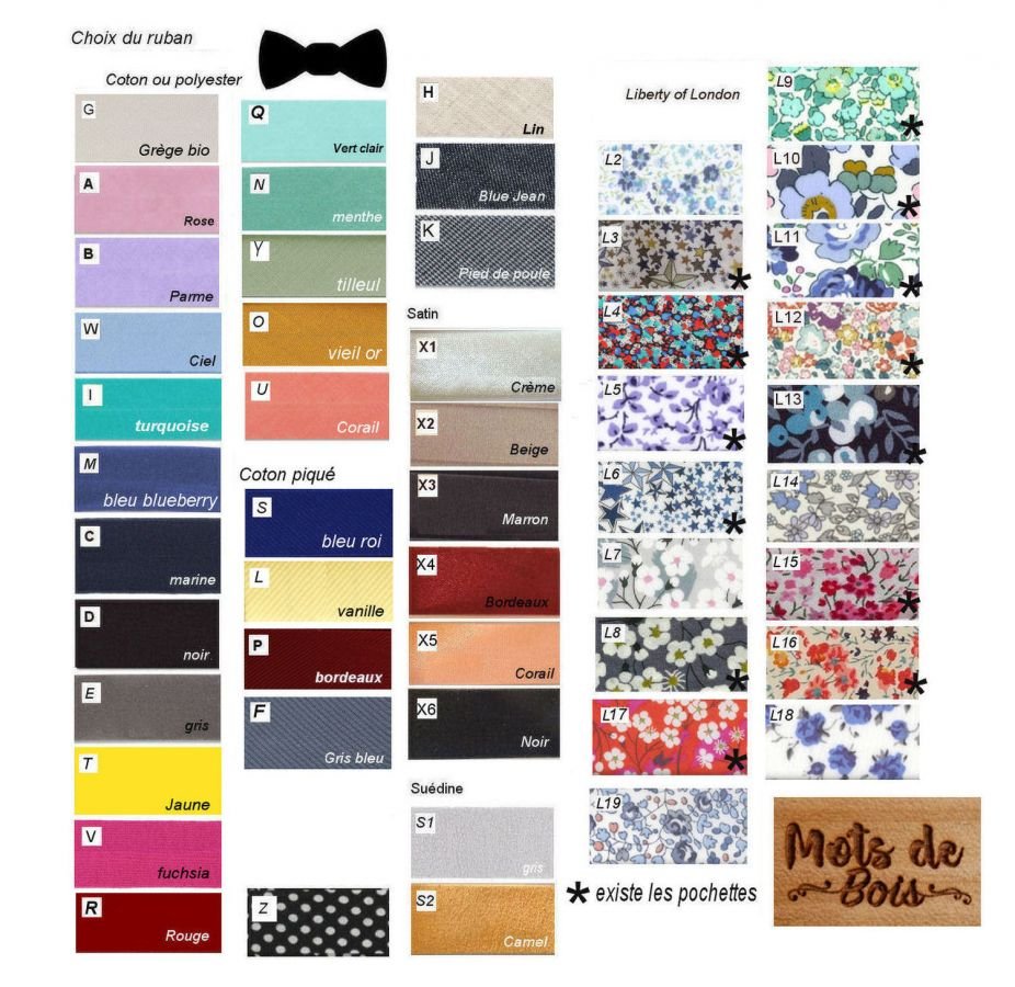 Tillverkad av 3 mm tjock poppelplywood, därför lätt och klar, lämnas naturlig (europeiskt ursprung) dekorerad i mitten med det band du väljer. Mått: 7,5 x 3,8 cm. Svart elastiskt bandlås, med klämma, passar en halsstorlek från 25 till 39 cm (från 3 år) (alltid under noggrann uppsikt!). En fråga? Ett specifikt behov? Kontakta mig...
