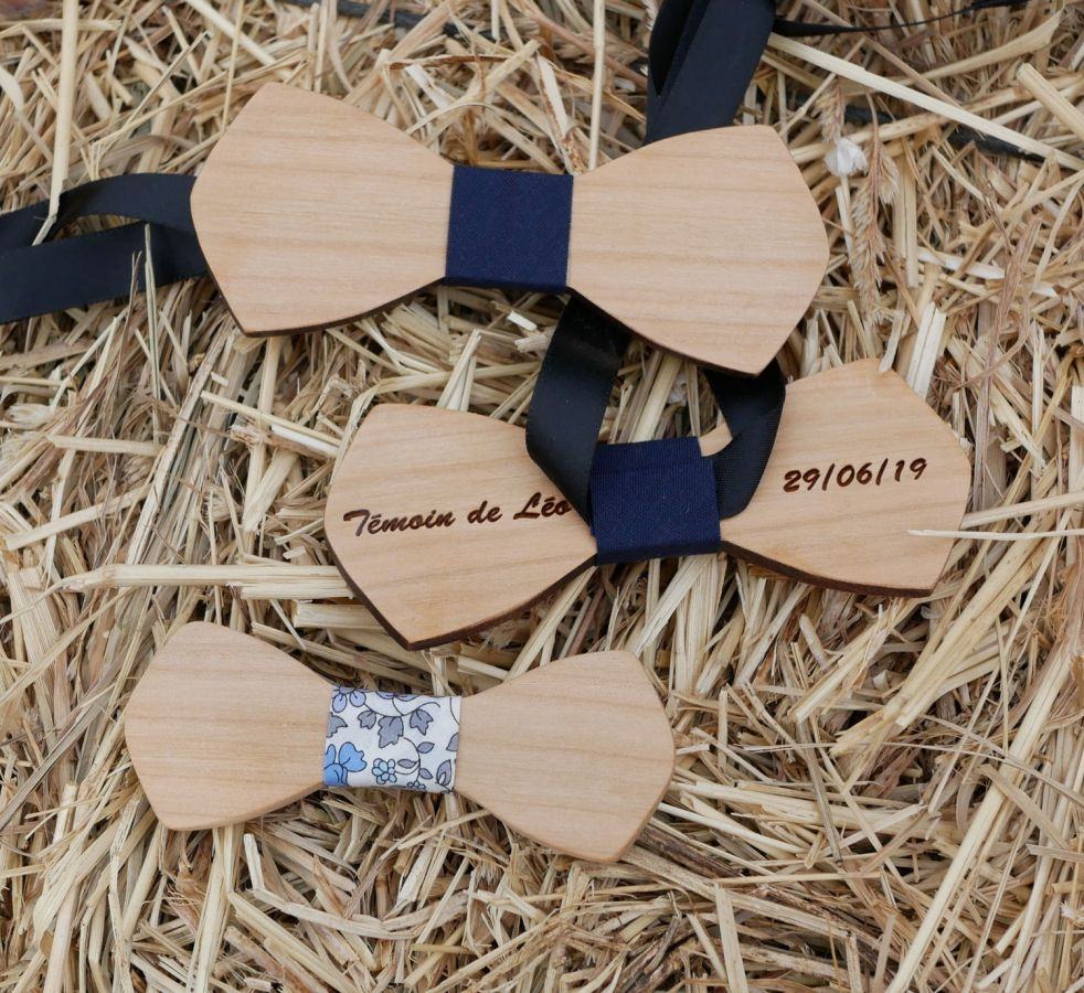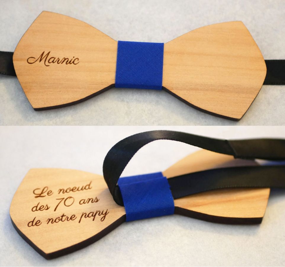 Elegant träsnodd : den minsta av våra herrsnoddar, tillverkad av körsbärsträ med ursprung i Frankrike, från ett sågverk i Ardèche, en naturligt elegant accessoar för män och en originell gåva till en vän, en make, en far, en gudfar, ett bröllopsvittne.... Denna snodd kan personaliseras genom lasergravyr med ett namn, ett litet citat, datumet för händelsen (t.ex. datum för bröllopet), rollen på bröllopet (brudgummen, brudens far, etc